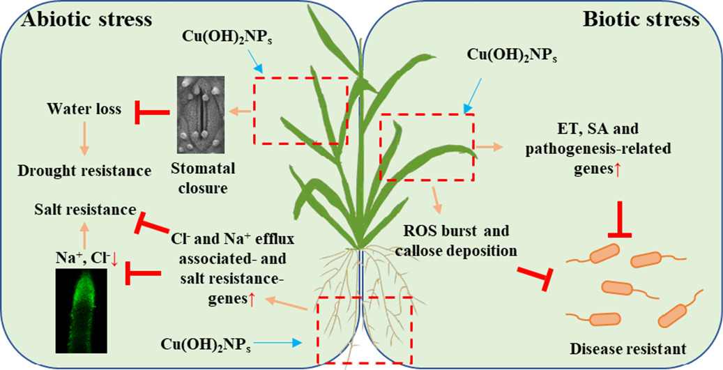 Cu(OH)2NPs激活水稻多種免疫反應(yīng),包括活性氧(ROS)爆發(fā)、胼胝質(zhì)沉積、抗病相關(guān)基因上調(diào)以及氣孔閉合。有趣的是,Cu(OH)2NPs引起的免疫抵抗不依賴水楊酸信號(hào)通路,而是部分依賴乙烯信號(hào)轉(zhuǎn)導(dǎo)。這一發(fā)現(xiàn)凸顯了Cu(OH)2NPs激活植物免疫路徑與銅離子的區(qū)別。同時(shí),Cu(OH)2NPs可能通過上調(diào)鈉/氯離子外排基因減少根部Na、Cl含量超過75%。干旱條件下,Cu(OH)2NPs通過關(guān)閉水稻氣孔,減少水分流失率,提高稻苗的存活率。這項(xiàng)研究為管理BLS和提升植物對非生物脅迫的抗性提供了創(chuàng)新見解和潛在治療方案,有望大幅降低銅基農(nóng)藥用量,突破卡脖子技術(shù),提升我國在銅基農(nóng)藥研發(fā)領(lǐng)域的競爭力,為農(nóng)業(yè)可持續(xù)發(fā)展探索了可行路徑。