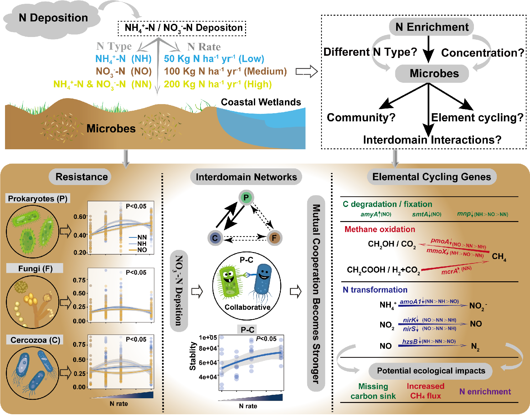 濱海濕地是維系全球生態平衡的關鍵生態系統,正日益受到多重環境變化的嚴峻挑戰,大氣氮沉降加劇作為全球變化的核心特征之一,其對濕地土壤微生物群落及生態功能的影響機制仍存在諸多不確定性。黃河三角洲濱海濕地生態價值突出,其生態保護與修復是我國生態文明建設與黃河流域生態保護和高質量發展重大國家戰略的重要內容,然而針對該區域多營養級土壤微生物群落在不同氮沉降環境下的響應模式與功能演化規律,目前仍缺乏系統性認知。