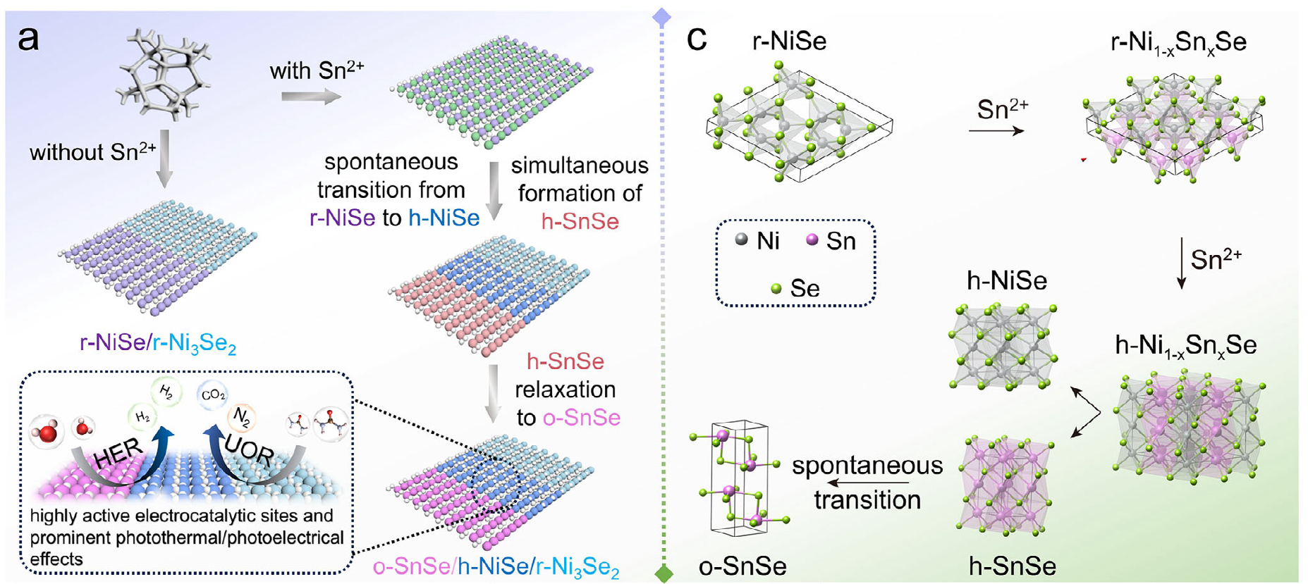 針對傳統水電解能耗高及尿素氧化反應(UOR)動力學緩慢的難題,該研究創新性地利用Sn2+誘導原位相調制,成功構建了o-SnSe/h-NiSe/r-Ni3Se2三元多功能異質結構。馬超副教授通過第一性原理計算,深入揭示了界面相變微觀機制,并闡明了該結構顯著降低UOR決速步能壘的理論依據。