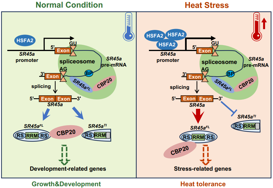 高溫脅迫是限制植物生長發(fā)育和作物產量的重要環(huán)境因素之一。無論是短期還是持續(xù)的高溫刺激,都會引發(fā)植物一系列復雜的生理與分子響應。可變剪接作為關鍵的轉錄后調控機制,在植物應對高溫脅迫過程中發(fā)揮重要作用。然而,脅迫信號如何在剪接調控因子自身層面實現(xiàn)精細調控,仍缺乏系統(tǒng)性認識。