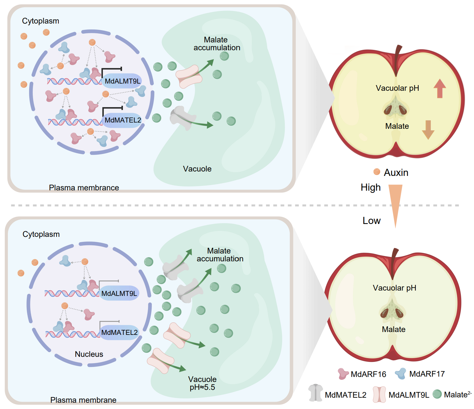 本研究在‘嘎啦’(Ma1ma1)ב藤牧一號’(Ma1Ma1)蘋果雜交后代及果實發育過程中發現,生長素水平與蘋果酸(主要有機酸)含量在Ma1Ma1和Ma1ma1基因型中均呈顯著負相關關系,生長素抑制蘋果酸積累不依賴于控制蘋果酸度的主效位點Ma1。進一步通過分離群體分組分析法(BSA)與轉錄組測序(RNA-seq),鑒定出兩個生長素響應因子MdARF16和MdARF17作為關鍵調控因子抑制蘋果酸積累。功能驗證表明Ma1同源蛋白MdALMT9L和多藥及毒性化合物外排蛋白MdMATEL2是液泡膜定位的蘋果酸轉運蛋白,生長素抑制MdALMT9L和MdMATEL2基因的表達,而對Ma1無影響。在‘魯麗’(雜交后代品種)蘋果中進行機制分析表明,MdARF16和MdARF17協同作用,直接結合MdALMT9L和MdMATEL2的啟動子并抑制其轉錄阻礙蘋果酸由細胞質向液泡的轉運從而降低蘋果酸含量。綜上,本研究揭示了一條獨立于Ma1的生長素-MdARF16/17調控通路,該通路通過調控由胞質到液泡的蘋果酸轉運控制果實酸度,為基于生長素信號調控果實有機酸性狀提供了新的分子機制框架。