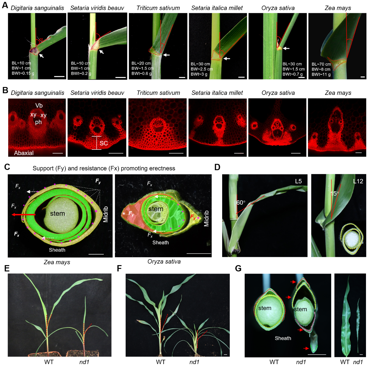 在本研究中,團(tuán)隊(duì)通過對玉米、水稻、小麥等多種植物的葉片結(jié)構(gòu)進(jìn)行細(xì)胞學(xué)比較分析,創(chuàng)新性地提出葉片角度并非由單一因素決定,而是“支撐力”與“下拉力”動態(tài)平衡的結(jié)果。其中,“下拉力”主要來源于葉片自身的重力。相較于水稻、小麥等其他禾本科物種,玉米的葉片更長、更寬和更重,因此由自重引起的下垂趨勢也更為顯著。“支撐力”則是作物對抗葉片下垂的反作用力,主要取決于三個(gè)關(guān)鍵因素,包括葉鞘包裹莖稈的緊實(shí)度、層數(shù)和高度;葉枕(葉片與葉鞘連接處)區(qū)域的木質(zhì)化程度、以及主葉脈的韌性和長度。研究發(fā)現(xiàn),玉米之所以能在擁有碩大葉片的同時(shí),依然保持相對較小葉夾角和直立的姿態(tài),關(guān)鍵在于其演化出強(qiáng)大的機(jī)械支撐強(qiáng)度。與水稻、小麥相比,玉米葉鞘包裹莖稈層數(shù)多且緊實(shí),葉枕區(qū)域沉積了更多的木質(zhì)素,并且形成了厚實(shí)的厚壁組織。這些結(jié)構(gòu)如同內(nèi)置的“鋼筋骨架”,為葉片提供了強(qiáng)大的力學(xué)支撐,有效抵抗了葉片重量帶來的下拉力,從而維持葉片的直立生長姿態(tài)。進(jìn)一步,研究團(tuán)隊(duì)通過降低玉米葉鞘對莖稈的包裹層數(shù)和緊實(shí)度(nd1),打破支撐和下拉力間的動態(tài)平衡,導(dǎo)致玉米葉夾角顯著增加并引起葉片下垂,證實(shí)了以上理論的真實(shí)性(圖1)。