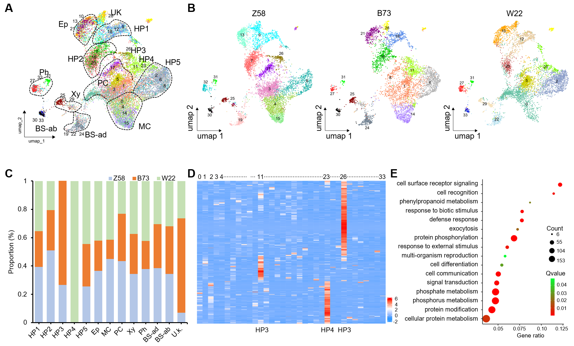為從細(xì)胞層面解析不同株型自交系機(jī)械支撐能力差異的分子基礎(chǔ),研究團(tuán)隊(duì)對Z58(緊湊型)、B73(中間型)和W22(平展型)三個(gè)玉米自交系的葉枕區(qū)域進(jìn)行了單細(xì)胞核轉(zhuǎn)錄組測序,成功構(gòu)建了包含18,427個(gè)細(xì)胞核、34個(gè)細(xì)胞簇的高分辨率葉枕區(qū)細(xì)胞圖譜。通過跨品系比較分析,發(fā)現(xiàn)HP3細(xì)胞亞群(近軸側(cè)皮下細(xì)胞)僅在Z58和B73中存在,且木質(zhì)素合成代謝通路相關(guān)基因特異性富集。這一分子層面的特征與Z58近軸側(cè)木質(zhì)素沉積的組織學(xué)觀察高度吻合,從單細(xì)胞分辨率層面揭示了緊湊型品種近軸側(cè)木質(zhì)素沉積的細(xì)胞基礎(chǔ)(圖3)。