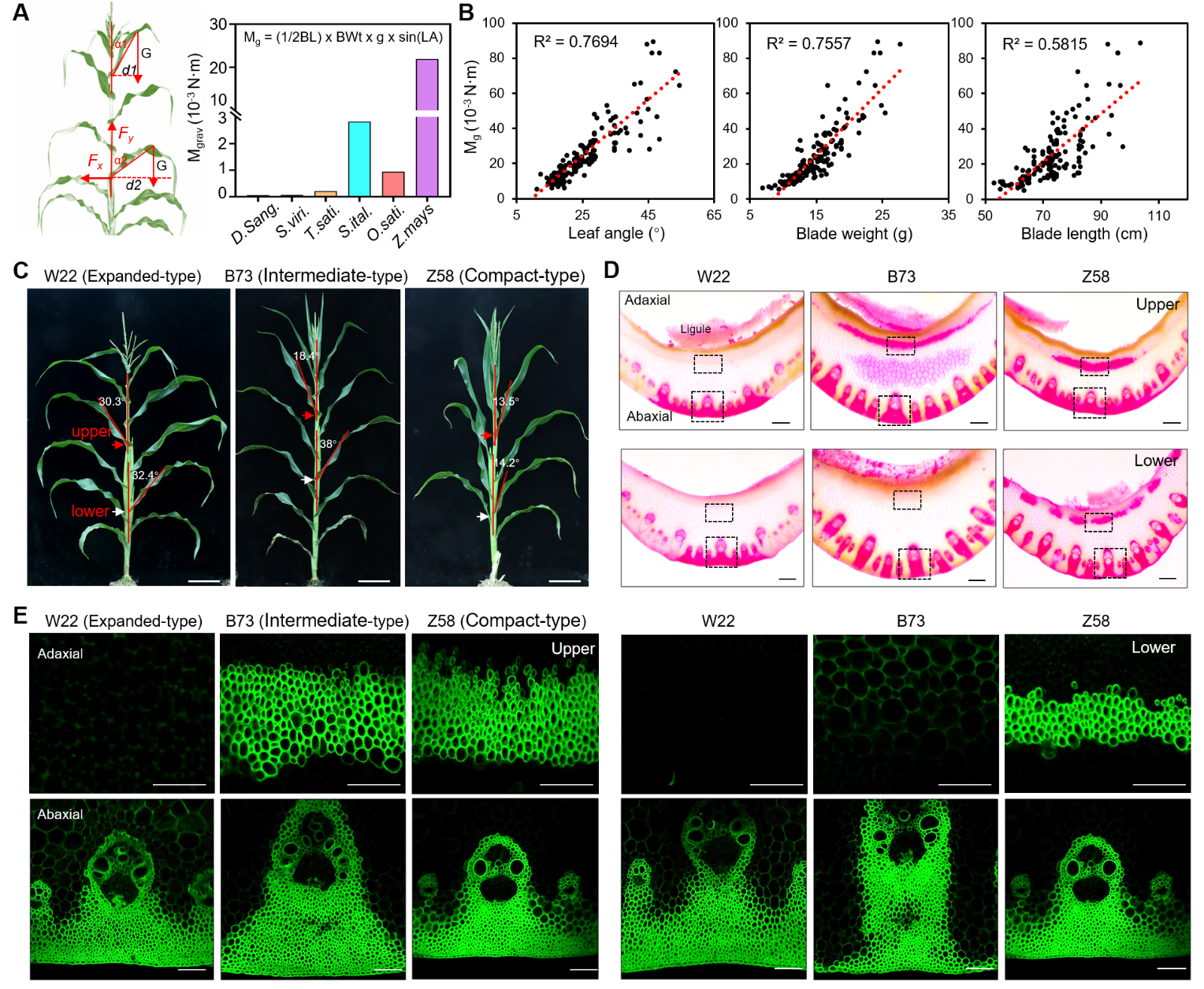 自然狀態(tài)下,植物葉片的機(jī)械支撐力和下拉力處于平衡狀態(tài)。為系統(tǒng)評估這兩種力,研究團(tuán)隊(duì)首次將物理學(xué)中的“力矩”概念引入植物形態(tài)分析,基于葉片質(zhì)量分布和幾何形態(tài)的合理簡化構(gòu)建了計(jì)算公式:M = 1/2BL × BWt × g × sin(LA)。通過對147份玉米自交系的生理指標(biāo)測定和分析,發(fā)現(xiàn)力矩主要由葉長、葉重及葉夾角共同決定,并與這些參數(shù)正相關(guān)。具體而言,葉夾角越大的自交系,其力矩越大,表明維持葉片平衡所需的機(jī)械支撐力越強(qiáng);反之,葉夾角較小的緊湊型自交系力矩較小,對機(jī)械支撐的需求也相應(yīng)減弱。