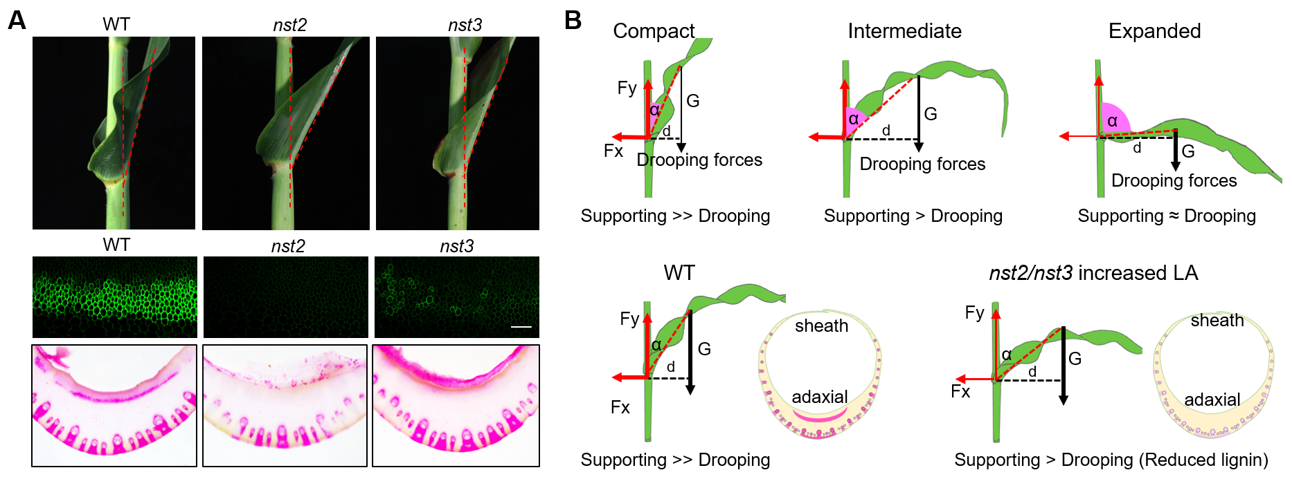 基于對三個(gè)自交系葉枕近軸側(cè)與遠(yuǎn)軸側(cè)轉(zhuǎn)錄組的比較分析,篩選出參與木質(zhì)素合成調(diào)控的關(guān)鍵轉(zhuǎn)錄因子—MYB和NAC家族成員。在平展型自交系W22中,這兩類轉(zhuǎn)錄因子家族基因在遠(yuǎn)軸側(cè)的表達(dá)量顯著高于近軸側(cè);而在緊湊型Z58和中間型B73中,其表達(dá)水平在兩側(cè)并無顯著差異。這一表達(dá)模式與三個(gè)自交系在近軸側(cè)木質(zhì)素沉積上的差異高度吻合,提示這些轉(zhuǎn)錄因子可能參與調(diào)控近軸側(cè)特異性木質(zhì)素合成。為進(jìn)一步驗(yàn)證候選基因的功能,研究選取NAC轉(zhuǎn)錄因子家族中的NST2和NST3進(jìn)行深入分析。RNA原位雜交結(jié)果顯示,NST2和NST3的轉(zhuǎn)錄本主要定位于維管束鞘、厚壁組織及葉枕近軸側(cè)皮下細(xì)胞,其空間分布與木質(zhì)素沉積位點(diǎn)高度一致。功能驗(yàn)證表明,相較于野生型,nst2和nst3突變體的葉夾角增大,葉枕近軸側(cè)木質(zhì)素沉積完全缺失,葉片最大支撐力顯著下降。綜合上述結(jié)果,NST2和NST3通過特異性調(diào)控葉枕近軸側(cè)木質(zhì)素生物合成,正向調(diào)節(jié)葉片的機(jī)械支撐能力,從而減小葉夾角(圖4)。