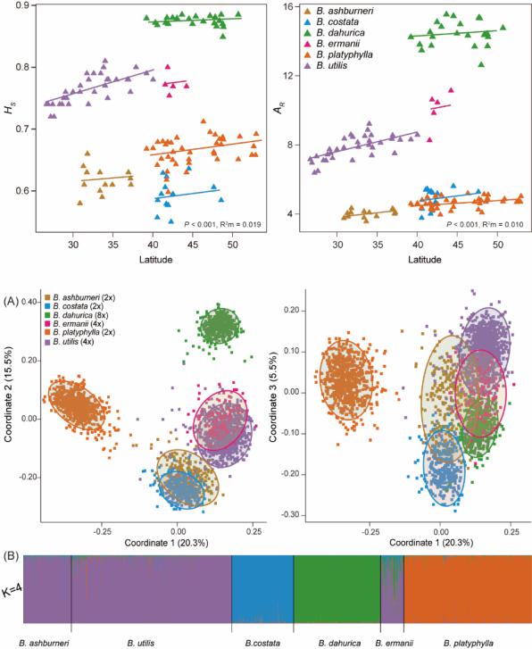 本研究對我國六種樺木屬(Betula)植物性、遺傳多樣性、遺傳結構及種間雜交進行了深入分析,旨在揭示第四紀氣候變化背景下物種擴散、雜交與遺傳多樣性的分布格局。結果表明,樺木遺傳多樣性隨性的增加而提高,且呈現南低北高的趨勢。這與歐洲多數植物遺傳多樣性南高北低的趨勢正好相反,反映了末次盛冰期對歐洲和東亞不同程度的影響。在遺傳結構方面,多數物種表現出明顯的種內分化,但耐旱且分布連續的B. dahurica缺乏遺傳分化,表明生態適應性和歷史分布連續性能夠促進基因流。此外,STRUCTURE分析顯示不同性物種之間普遍存在雜交與基因滲入,尤其是二倍體與四倍體之間的基因交流頻率顯著高于二倍體與八倍體之間,表明性差異可能是生殖隔離的重要屏障。