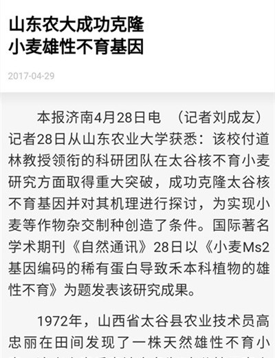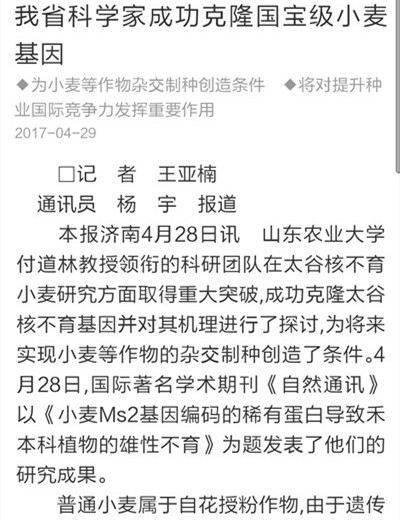 428,國際著名學術期刊《自然通訊》以《小麥Ms2基因編碼的稀有蛋白導致禾本科植物的雄性不育》為題,發表了山東農業大學付道林教授領銜的科研團隊在太谷核不育小麥研究方面取得重大突破。429,人民日報、大眾日報分別在重要版面對此項科研成果進行了報道。