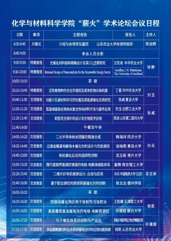 為進一步凝聚校友力量,加強校友交流共進,發揮優秀校友引領作用,助推山東農業大學“沖一流”建設,山東農業大學化學與材料科學學院于2024年4月26日-28日在泰安舉辦“薪火”學術論壇,圍繞化學在新材料、新能源、生命科學、醫藥、環境和農業等領域的交叉融合和最新研究成果進行學術交流。
